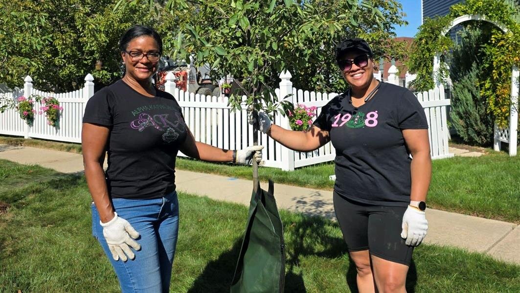 Kandice Saulsberry, Managing Funeral Director of Dale-Riggs Funeral Home, in collaboration with the Enhance Our Environment initiative of the Zeta Alpha Omega Chapter of Alpha Kappa Alpha Sorority, Incorporated and Keep Toledo/ Lucas County Beautiful assisted with planting trees in Point Place after tornadoes in 2023 damaged a significant number of trees in the area.